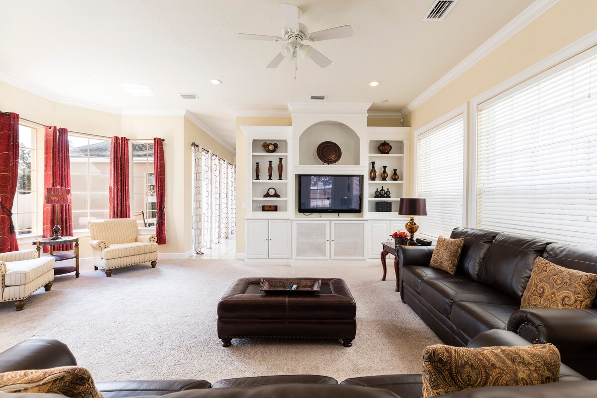 Ótrúlegt heimili í hinu fína samfélagi reunion resort. Næstum öll svefnherbergin á heimilunum eru hjónasvítur með fallegu sérbaðherbergi. Fullorðnir sem og litlu gestirnir okkar eru þeir sem verða virkilega fyrir skemmdum með vinsælum svefnherbergjum með ofurhetjuþema og herbergi með prinsessuþema. Gleymum ekki frábæra leikjaherberginu/leikherberginu okkar. Heimilið er tilvalið fyrir fjölskyldufrí með 5 lúxussvefnherbergjum, mörgum afþreyingarmöguleikum og ótrúlegri sundlaug/heitum potti með útsýni yfir golfvöllinn