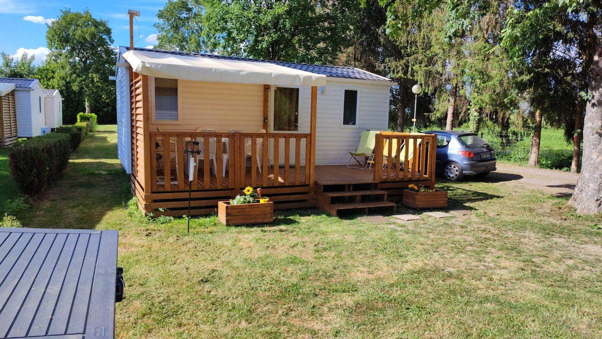 Fully equipped mobile home in a peaceful, green setting. Extras: - Fully covered terrace - Mosquito nets on all windows - Blackout blinds - Bed linen, duvets, pillows, and blankets are included in the rental price - Cleaning deposit refunded if the mobile home is left in the same condition as upon arrival. - Pets are welcome at no extra charge, but category 1 and 2 dogs are not allowed on the campsite.