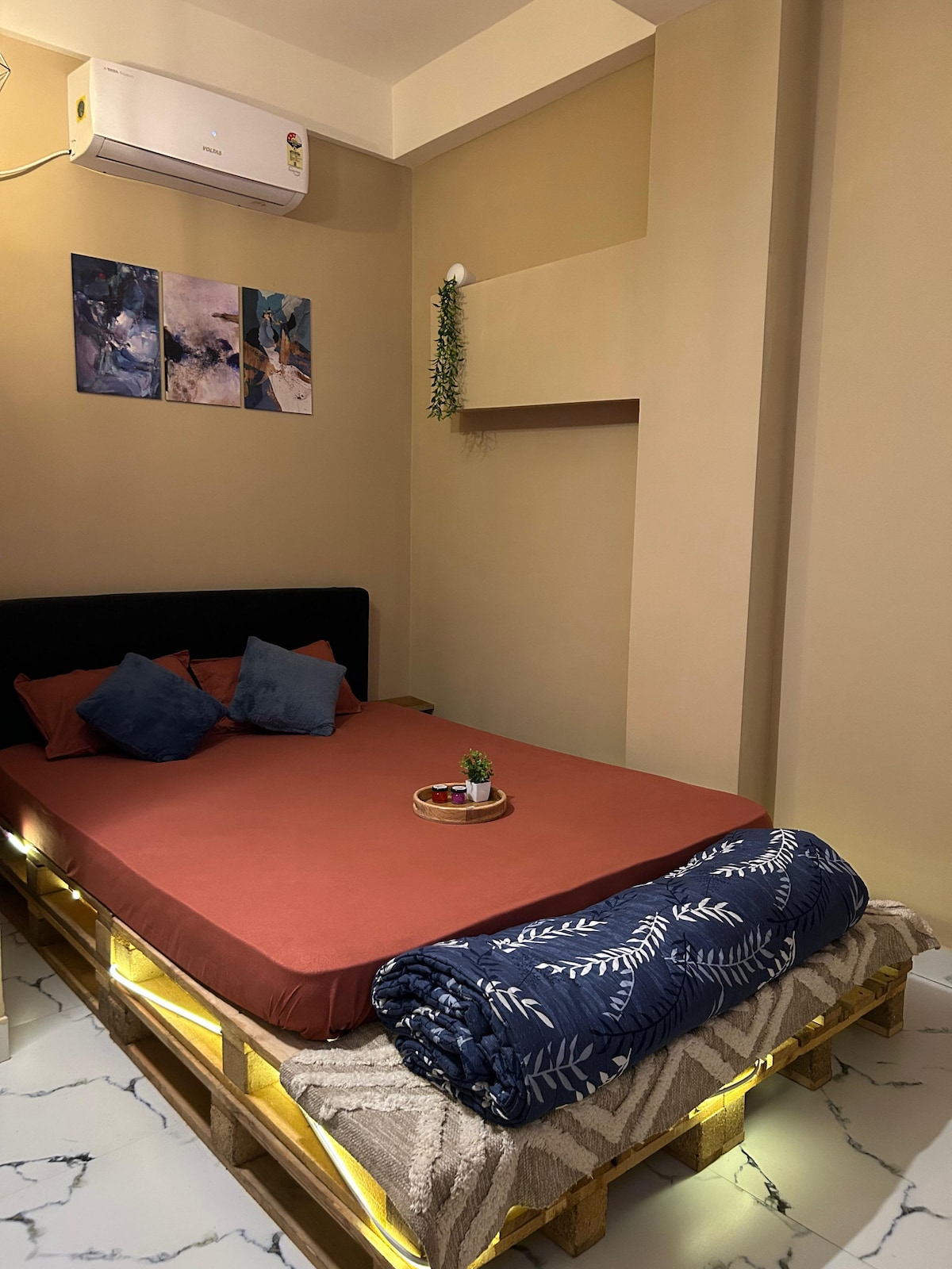 Notaleg 2BHK þjónustuíbúð nálægt Lokhra – fullkomin fyrir þægilega dvöl Njóttu friðhelgi heillar íbúðar með öllum þægindum heimilisins – sjálfvirku eldhúsi, loftræstingu, aflgjafa allan sólarhringinn, þráðlausu neti, lyftu og svölum til að slaka á. Hentar fyrir allt að 4 gesti (aukarúm í boði gegn gjaldi). Fullkomið fyrir friðsæla dvöl – ekki samkvæmisstaður – með teymi okkar til staðar til að uppfylla þarfir þínar fyrir mat og þægindum.