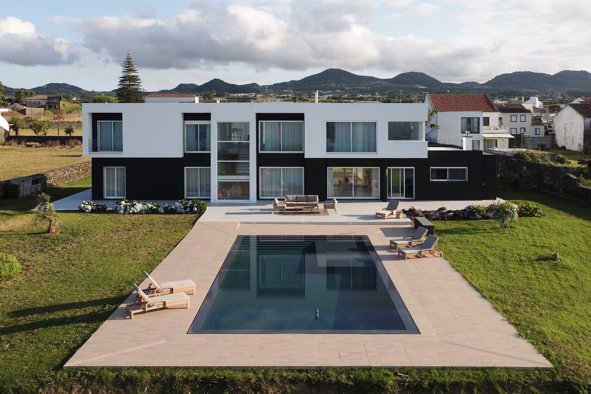 Loftkælt og upphitað hús sem rúmar 8-10 ppl. 5 mín göngufjarlægð frá bestu brimbrettaströndinni á Azoreyjum. Byggt árið 2012, þráðlaust net - trefjar (29mbps) og bílskúr, 2 einkasvefnherbergi með sér baðherbergi og verönd, 1 loftíbúð og aukaherbergi á 2. hæð, stór opin stofa og eldhús á fyrstu hæð með 3 hlutum til viðbótar. Myndarlegur bakgarður, bar-bq og þvottahús. Göngufæri frá börum, veitingastöðum og verslunum á staðnum og 10 mín. akstur til borgaryfirvalda í Ponta Delgada.