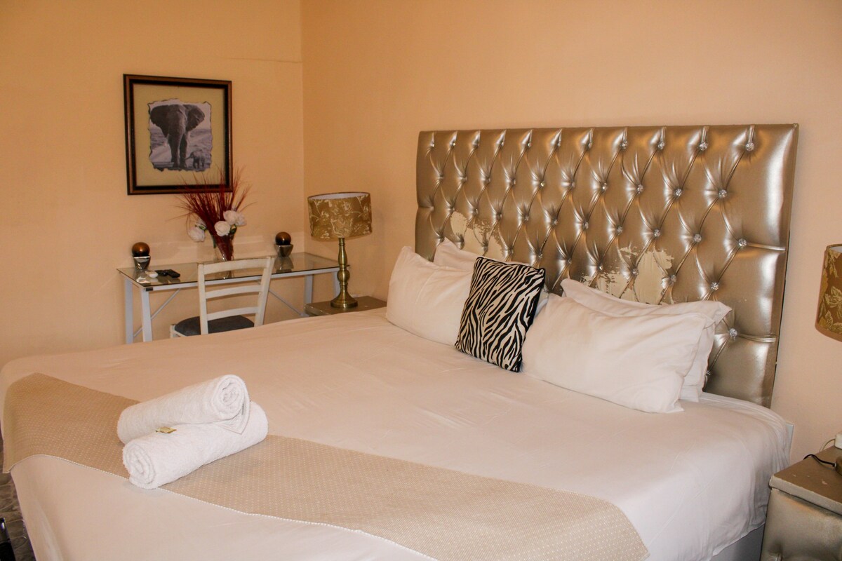 Welcome to our tranquil guesthouse in the heart of suburban Empangeni. Located in a large house with stunning architecture and beautiful garden. This Room has an en-suite bathroom with a shower and direct garden access and views. Equipped for the hot Zululand weather, there is an Air Conditioner. Guests have access to a Smart TV and high-speed Wi-Fi. Enjoy a swim in the pool or relax by the fireplace after a long day. (Please see other rooms listed on our host profile to find your ideal room).