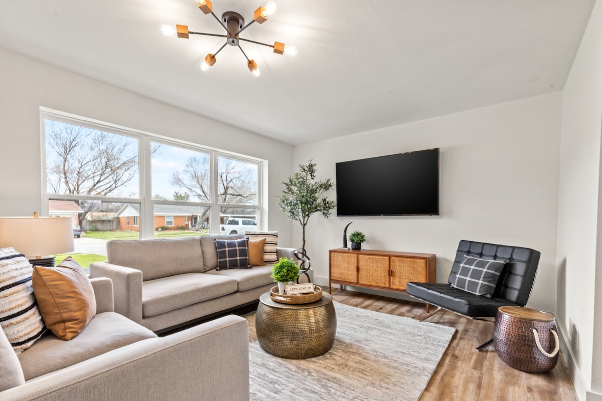 Welcome to our chic Texas-themed Airbnb! Centrally located, our stylish property boasts beautiful decor & plenty of amenities to provide you with a relaxing stay. Relax in the great room with a 65" smart TV, whip up a Texas-inspired meal in the fully equipped kitchen, or enjoy the big, fully-fenced backyard. Indulge in a restful night's sleep in one of the comfortable bedrooms. A quick commute to DFW Airport & countless attractions, experience Southern charm & convenience in the heart of Texas!