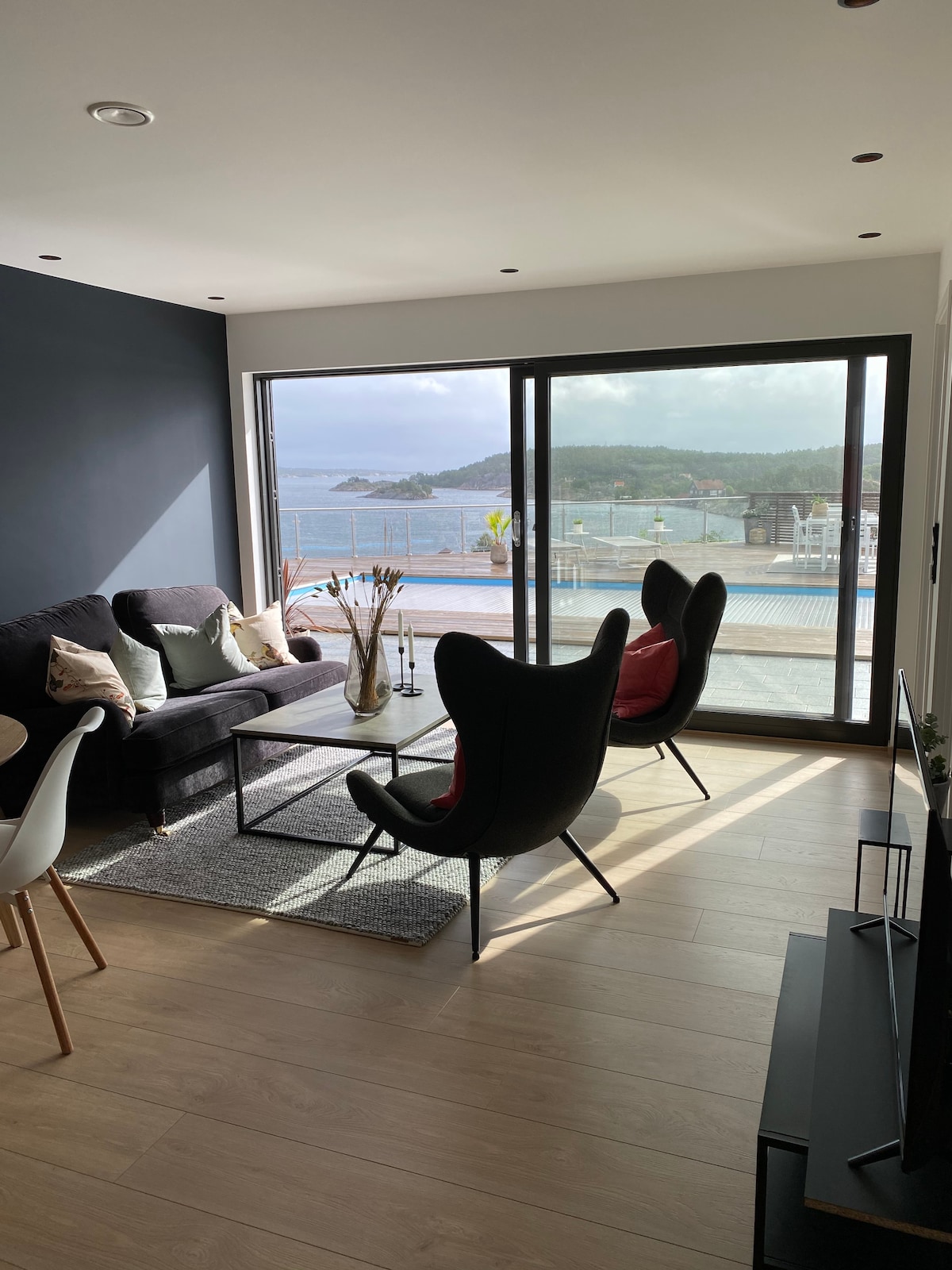 Glæný hágæða íbúð með töfrandi útsýni yfir innganginn að Risør. Staðsett nálægt miðborginni og sjónum, sem og mjög stutt í frábært göngu- og þjálfunarlandslag í Urheia. Laugin er 10 x 4 metrar og rúmar 30 gráður frá maí til október. Notkun á sundlaug er sérstaklega skipulögð fyrir helgi eða viku. Hafðu samband til að fá frekari upplýsingar