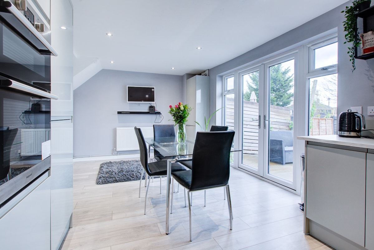 Góð stærð 2 hæða nútímalegt 3 herbergja heimili í Chelmsford. Aðeins 15 mínútna gangur í aðallestina til London og í 5 mínútna fjarlægð frá Broomfield-sjúkrahúsinu. Strætóstoppistöð og verslanir í 300 metra fjarlægð. Láttu þér líða eins og heima hjá þér með stóra matsölustaðnum í eldhúsinu sem liggur að stóra þilfarinu með grilli. Slappaðu af á kvöldin með vínglas í snotra herberginu og horfðu á allar himnarásir, þar á meðal kvikmyndir, himiníþróttir og netflix. 2 stór tveggja manna herbergi og eins manns herbergi til að sofa 6 manns.