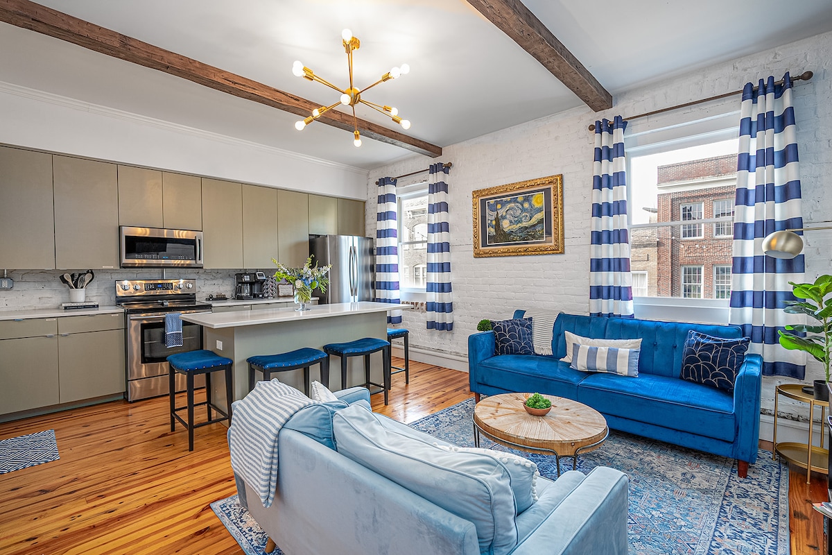Aðeins nokkur skref frá River Street! Upplifðu lífið í Savannah í sínu fegursta lagi í þessari uppfærðu, rúmgóðu íbúð í miðborginni. Njóttu tveggja svefnherbergja, tveggja baðherbergja og mikils náttúrulegs birtis frá vegg til veggs gluggum. Hlustaðu á borgina vakna til lífsins á meðan þú drekkur kaffi á svölunum. Besta staðsetningin er við Bay Street, í nokkurra mínútna fjarlægð frá áhugaverðum stöðum. Suðurríkjablær fylgja þægindum í þessari 134 fermetra íbúð á kjörstað á milli City Market og River Street (HUGSANLEGUR HÁVAÐI)