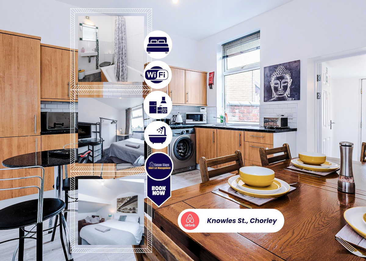 Verið velkomin á okkar heillandi og notalega Airbnb í markaðsbænum Chorley, Lancashire. Njóttu fullkominnar blöndu af sveitalegum sjarma og nútímaþægindum á okkar yndislega Airbnb. Hvort sem þú ert hér til að njóta friðsæls afdreps, notalegs dvalarstaðar fyrir fjölskylduhátíð eða ævintýralega skoðunarferð er heimilið okkar tilbúið til að taka á móti þér með opnum örmum. Forstofa Stofa - 2 sófar sem tvöfaldast sem 2 einbreiðir svefnsófar Eldhús Garður Svefnherbergi 1 - rúm í king-stærð Svefnherbergi - 2 hjónarúm Baðherbergi - uppi