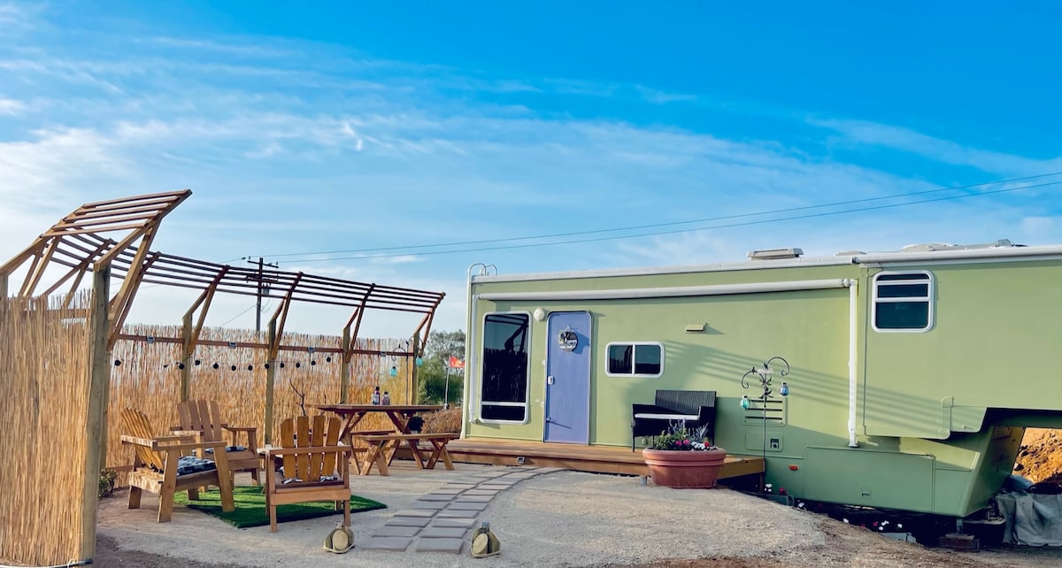 Dvölin þín bjargar lífum! Gistu í enduruppgerðu húsbíli í sveitastíl með einu svefnherbergi á góðgerðabýli. Allar bókanir hjálpa til við að fæða og annast hesta, geitur og önnur dýr sem við höfum bjargað. Snarl, kaffi og vatn innifalið. Gasgrill og eldstæði í einkagarðinum þínum. Kynnstu dýrunum, skoðaðu 9 hektara af friðsælli einkalóð og njóttu vínbúða Temecula í næsta nágrenni. Fullkomið fyrir pör eða fjölskyldur sem vilja komast í frí sem skiptir máli. Annar húsbílsstaður á lóðinni fyrir stóra hópa.