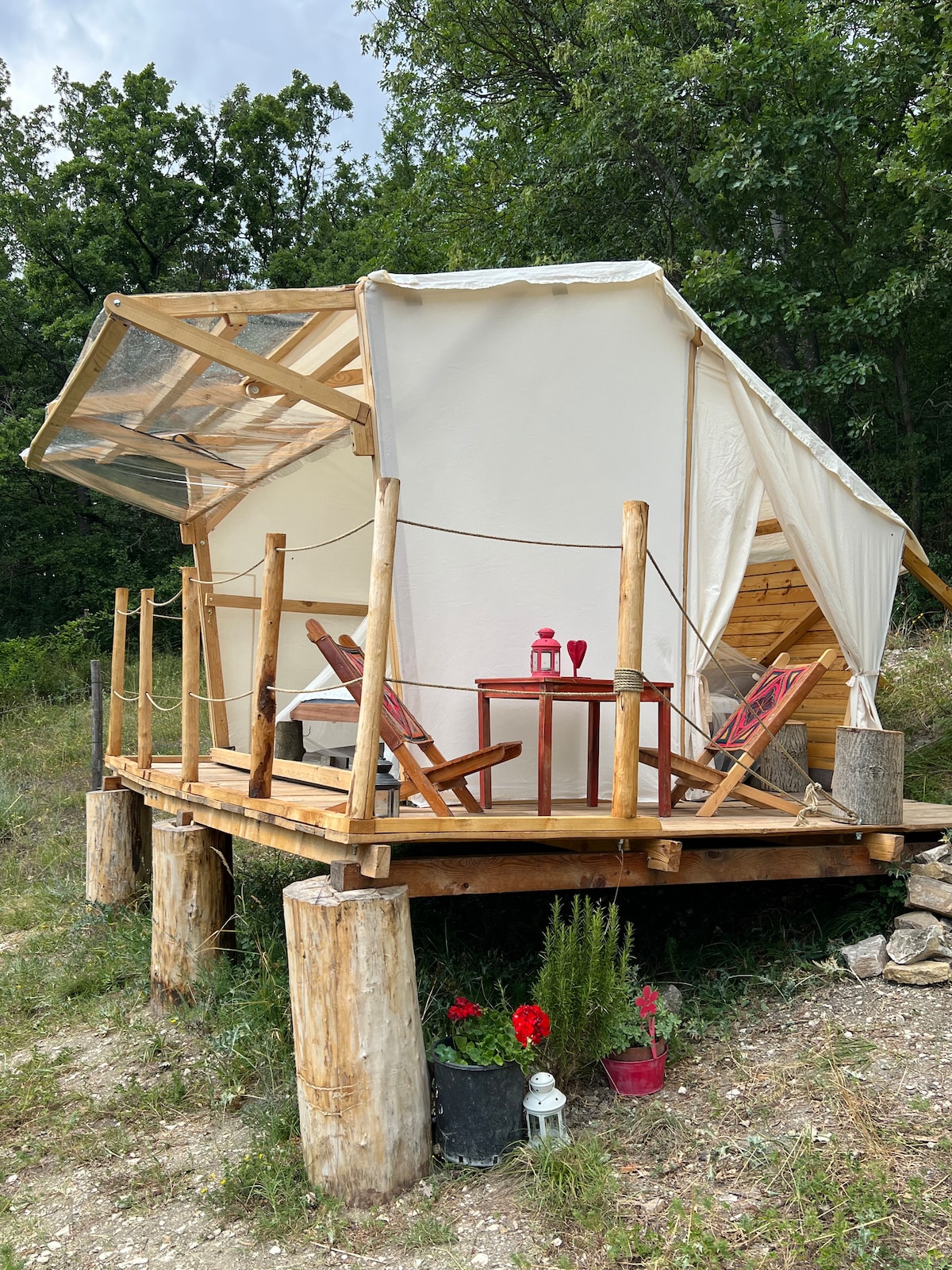 Upplifðu einstaka rómantíska upplifun í snertingu við náttúruna þar sem þú vaknar við söng fuglanna og sofnar og dáist að stjörnubjörtum himninum. 5 metra rúmgóða tjaldið okkar er staðsett í grænni grasflöt, nokkrum skrefum frá ánni með kristaltæru vatni. Í þessu einstöku náttúruhorni getur þú notið náttúrulegrar heilsulindar við ána, farið í gönguferðir eða slakað á í hlýlegu baðkeri og notið fegurðar landslagsins í kring í algjörri kyrrð .