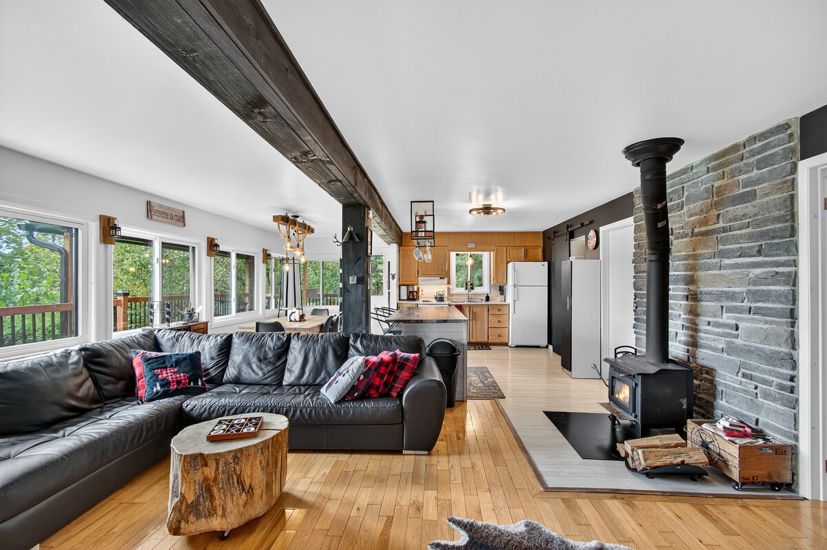 Stór sveitalegur og hlýr bústaður: við vatnið, heilsulind, viðarinn sem brennur innandyra og utandyra. Tilvalinn staður til að slaka á fyrir pör, fjölskyldur eða vinahópa. Leyfðu þér að sökkva þér niður í eðli Laurentians og koma og njóta sundsins, kajakanna og gönguferðanna. Sveitalegur og hlýlegur viðarskáli: viðarbakkinn, heilsulind, viðarinn. Tilvalinn staður til að slaka á í pari, með fjölskyldu þinni eða vinum. Vertu sökkt í eðli Laurentides og njóttu sundsins, kajaksins og gönguferðanna.