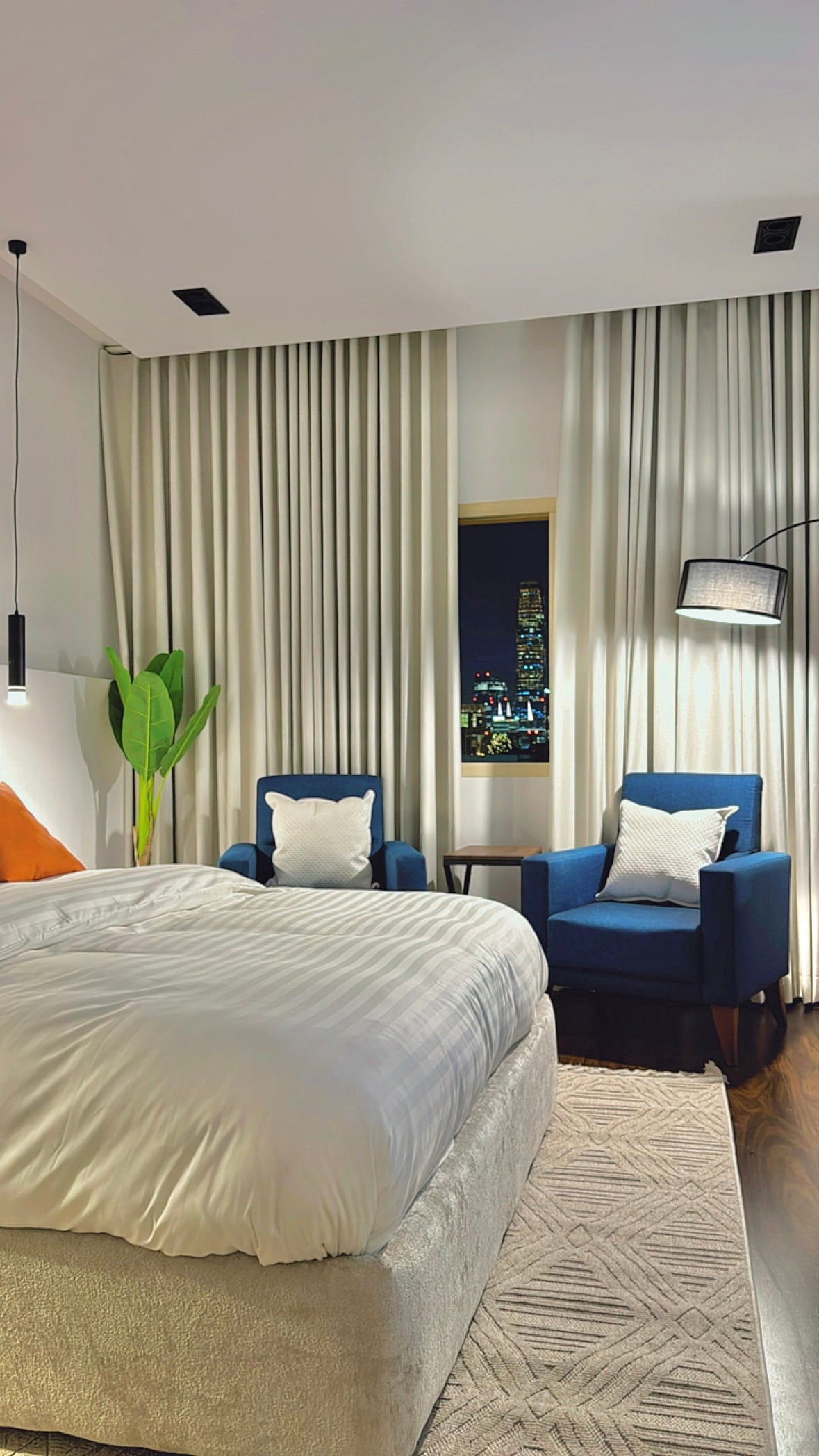 Nútímaleg 1BR hótelíbúð á rólegu svæði. Sjálfsinnritun, þráðlaust net, sjúkradýna, úrvalssófi, kaffihorn, hótelþægindi og fullbúið eldhús. • Frábær staðsetning í Norður-Ríad, 1 km frá hringveginum í norðurhlutanum: • Flugvöllur: 12 mín. • Fjármálamiðstöð: 15 mín. • Riyadh-garðurinn, Nakheel, Granada Mall: 10–20 mín. • Riyadh Season & Boulevard: 15–20 mín. • Imam, Princess Noura og e-háskólinn: 10–15 mín. • Athugaðu ⚠️ Dagleg þrif í hótelstíl eru í boði.