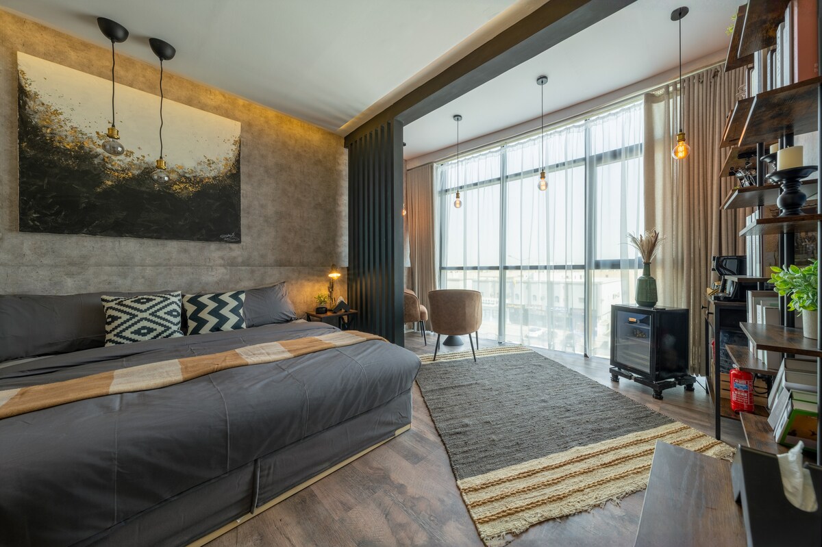 Lúxusgisting í hjarta Riyadh, nálægt King Khalid-flugvelli og Yarmouk-neðanjarðarlestarstöðinni, vel staðsett með skjótum aðgangi að helstu áhugaverðu stöðum borgarinnar. Stílhreint og friðsælt stúdíó Nútímalegt með mjúku rúmi og þægilegum hótelpúðum með stórum sófa og hágæða QLED-skjá. Rúmgott útitorg með kvikmyndahúsi utandyra með skjávarpa, grilli og arni ásamt nútímalegum tveggja manna nuddpotti. 5G og Netið , YouTube, Netflix, OSN Njóttu áskriftar Hratt og stöðugt fyrir fyrirtæki eða frístundir. Hljóðeinangrun, sjálfsinnritun og bílastæði fyrir framan bygginguna og í kjallaranum eru í boði.