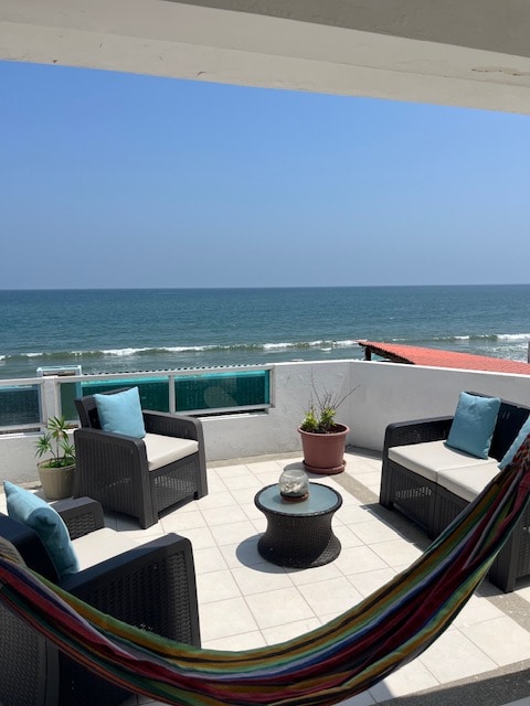 Lleva a toda la familia a este lugar acogedor. Dentro de una urbanización con guardia en garita para la seguridad de los hospedados. Cuenta con piscina en área social y estacionamiento. Hospedaje completamente seguro y confortable. Vista al mar y a pocos pasos de la playa y malecón. Cuenta con lavadora para que tú estadía sea más amena. Puede hacer uso de cancha de volley de playa, cancha de tenis y parque.