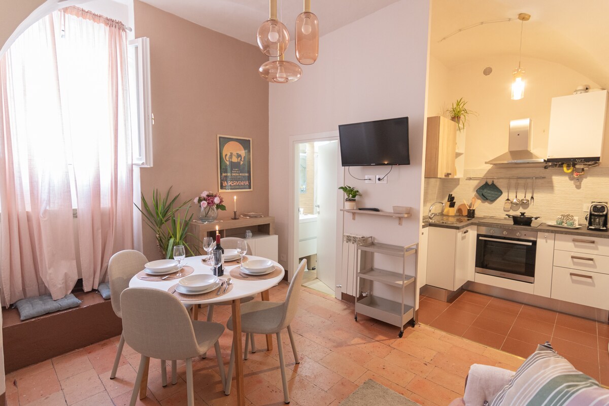 LÍTIL ÍBÚÐ tilvalin fyrir 1 eða 2 manns, sem samanstendur af stofu, svefnherbergi og baðherbergi með sturtu. á rólegu og einkennandi svæði. Það er ánægjulegt að gleyma bílnum þínum og ganga, aðeins mínútur í burtu er Corso Vannucci, Íhaldsskólinn, Háskólinn fyrir útlendinga og söfn. Fullkomið þráðlaust net fyrir vinnuferðir. ALLIR STAÐIRNIR SEM SÝNDIR eru á MYNDUNUM eru GÓÐ GÖNGULEIÐ FRÁ ÍBÚÐINNI Því miður er hún ekki aðgengileg þeim sem eiga við hreyfigetu að stríða.