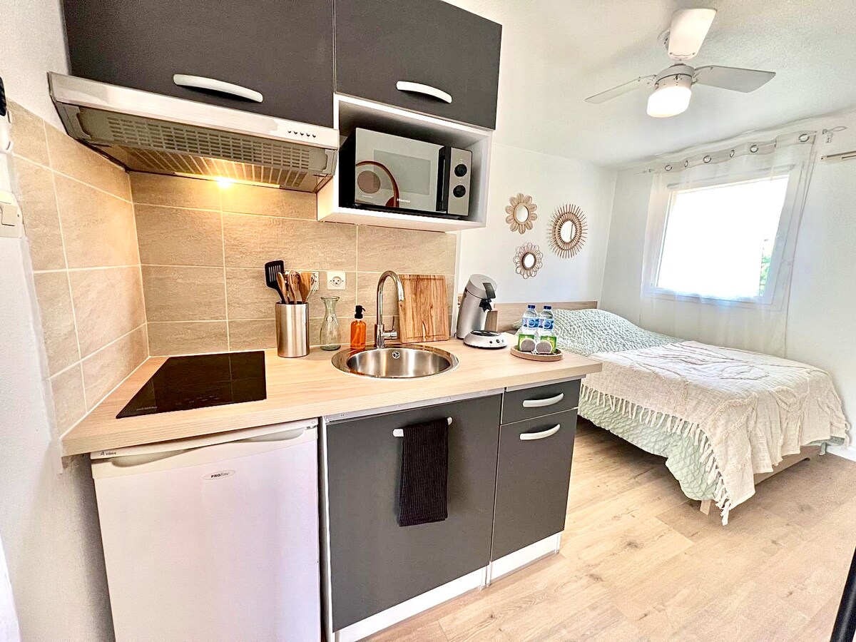 Verið velkomin í kokteilinn þinn í Avignon Þessi bjarta og vandlega skreyta stúdíóíbúð býður upp á róandi andrúmsloft. Það er fullkomlega staðsett gegnt sporvagninum og í 2 mínútna fjarlægð frá háskólanum og þar er auðvelt að komast að sögulega miðbænum og undrum hans. Þægilegt rúm, vel búið eldhús, þráðlaust net, loftvifta/hitari: Allt er hannað til að tryggja þægindi, hvort sem þú ert á ferðalagi, vinnuferð eða í vellíðun. Áður stúdentahúsnæði sem allir hafa nú aðgang að og eru öruggir.
