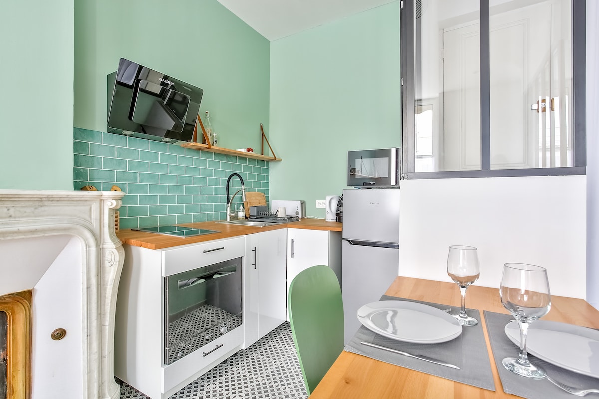 Stúdíóið okkar, sem er 24 m2 að stærð, er í miðbæ Rochefort, í 10 mínútna göngufjarlægð frá varmaböðunum, nokkrum metrum frá Place Colbert og Corderie Royale. Á jarðhæð, mjög hljóðlátt, þó að stúdíóið sé með útsýni yfir götuna. Hún samanstendur af eldhúsi, spanhelluborði, brauðrist, katli, Nespresso, ísskáp með aðskildu frystihólfi. Rúmið (160 x 200) er aðskilið frá restinni af herberginu með skrautvegg. Athugaðu að það er engin uppþvottavél.