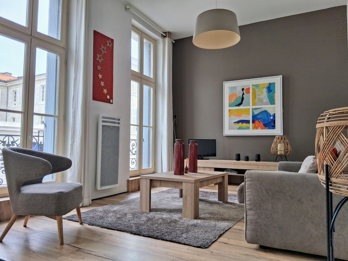 Við bjóðum þér að gista í notalegu tvíbýli sem er 130 m2 flokkað 3 ***. Stofan er björt og þaðan er yfirgripsmikið útsýni yfir þök Rochefort. Þessi íbúð er á 2. og 3. hæð (efstu). Það er borið fram með einkalyftu upp á 2. hæð. Þetta stórhýsi er aðeins með 2 íbúðir. Staðsett við rólega götu í miðborginni og þú getur kynnst borginni og verslunum hennar í innan við 10 mínútna göngufjarlægð. Hitaböðin eru í innan við 5 mínútna göngufjarlægð.