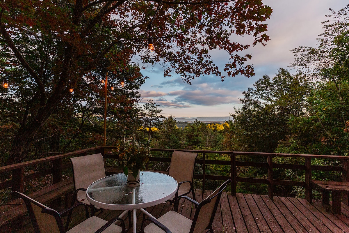 Nýuppgert heimili okkar er fullkomið frí fyrir 1-2 fjölskyldur sem sofa 10 sinnum vel. Staðsett efst á fjallinu, þú verður steinsnar frá ótrúlegum þægindum Massanutten allt árið um kring (sundlaugum, brekkum, golfvöllum, golfvögnum, minigolfi o.s.frv.). Við erum með sjónvarp í þremur af fjórum svefnherbergjum okkar og stórt sjónvarp í stofunni. Stórt borðstofuborð sem tekur 8 manns í sæti. Tvær stórar verandir fyrir utan. Gasgrill, eldstæði, matsölustaðir utandyra og fleira!