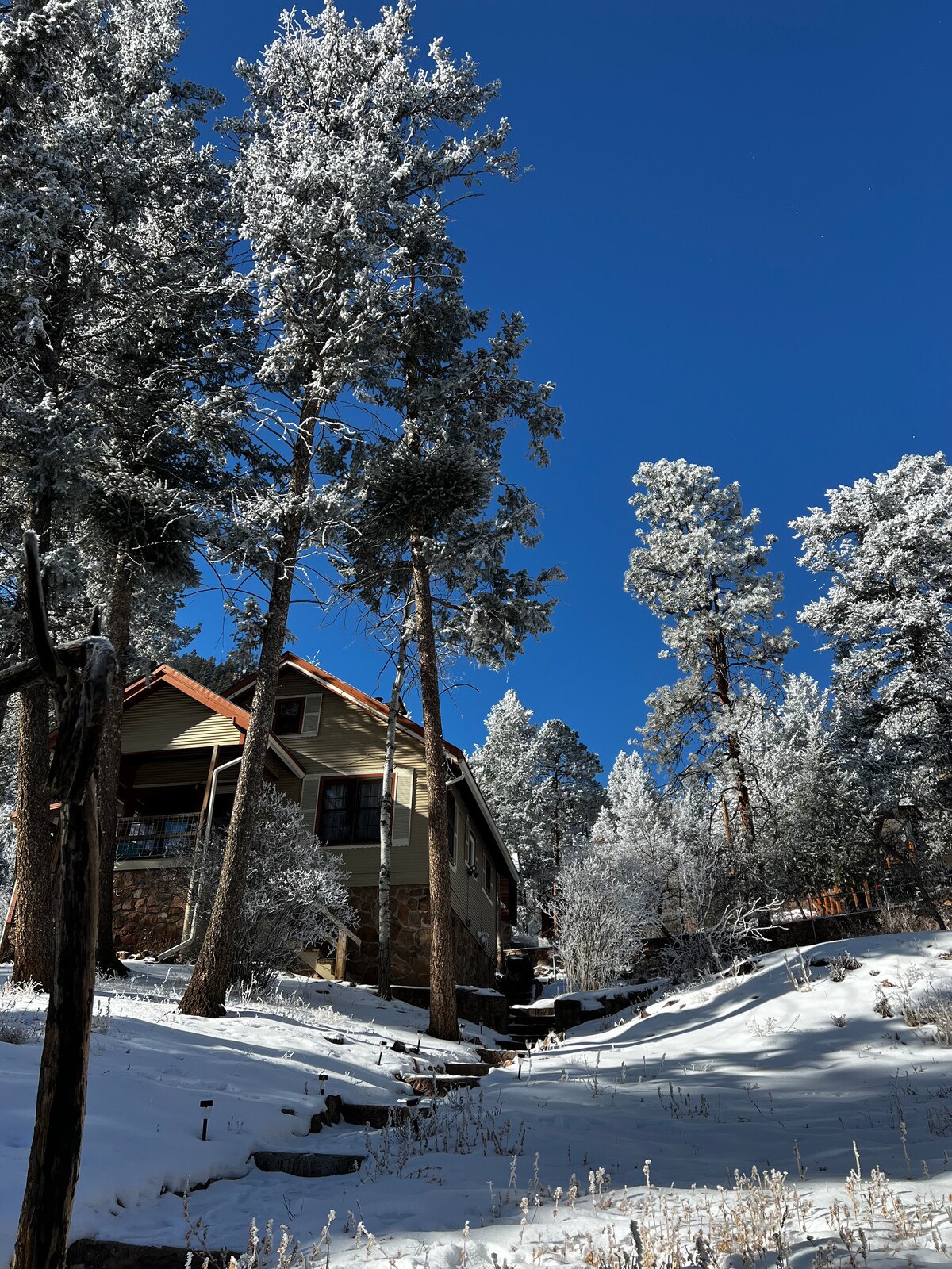 Welcome to the Treehouse - Your Colorado Getaway. Perched high in the trees with panoramic views, a HUGE bathtub, coffee bar with local coffee, two decks, and KING sized bed, you’ll never want to leave. This completely remodeled, octagon treehouse is just 15 minutes from most attractions in Colorado Springs and 5 minutes from the famous Pikes Peak Highway and gorgeous hiking trails - you are right in the middle of plenty to do while also being tucked away in your own little forest paradise.