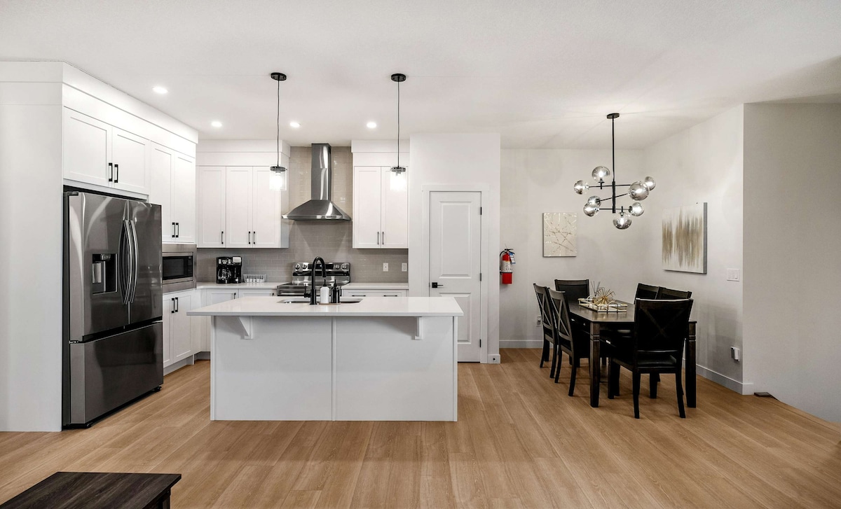 Welcome to a rare Calgary stay that blends the space of a multi-story townhouse with the flexibility of a private suite two units seamlessly combined into one stylish retreat. With 4 bedrooms, 3.5 bathrooms, and thoughtfully styled interiors in calming whites, greys, and teals, this home is perfect for families, groups, or long-stay travelers who value privacy, flow, and comfort. Located in a vibrant urban community, you'll enjoy clean design, luxury touches, and smart separation of space inclu