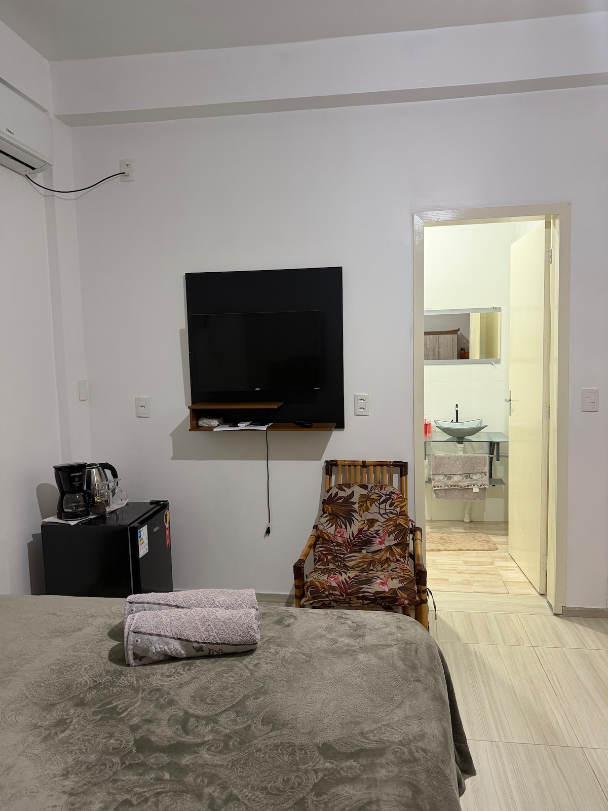 Kitnet 1 Quarto (FICA NO TÉRREO) Cama box casal, ar condicionado! Disponibilizamos roupas de cama e banho! 1 banheiro - secador de cabelo. 1 frigobar 2 sofás TV Chaleira elétrica !!NÃO TEM COZINHA !!! Estacionamento no local sem área coberta! Abrace a simplicidade neste lugar tranquilo e bem-localizado.