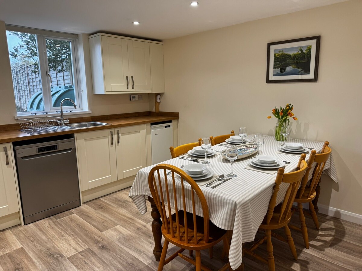 Vel skipulögð viðbyggingin er með sérinngang, bílastæði fyrir utan og þar er svefnherbergi í king-stærð, setustofa, eldhúskrókur (vinsamlegast lestu hér að neðan) og baðherbergi með baðherbergi og aðskilinni sturtu. Hér er magnað útsýni yfir akrana til að sjá hesta, sauðfé og nautgripi á beit í ökrunum fyrir utan. Þessi viðbygging er hljóðlát, þægileg og afmörkuð og þar er te og kaffi í boði. Hafðu samband við Amöndu til að fá hagstæðari gistingu utan háannatíma í 4 nætur