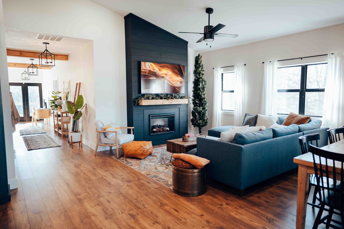 Verið velkomin á býlið í Merry Meadows! Okkur yrði sönn ánægja að fá ykkur í heimsókn á heimili okkar sem er staðsett í Ozark-skóginum. Þú átt eftir að elska hvernig birtan síast inn yfir hæðirnar á meðan þú undirbýrð morgunverðardrykkinn þinn í opna, fullbúnu eldhúsinu okkar. Á kvöldin getur þú sökkt þér í eitt af notalegu rúmunum okkar sem eru úthugsuð til hvíldar og ánægju. Njóttu hljóða skógarins og nærliggjandi býla frá einkapallinum aftan við húsið og alls þess róleika sem sveitaheimilið okkar hefur upp á að bjóða!