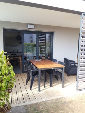 Appartement cosy, chaleureux de 46 m2 avec terrasse Sud aménagée, arborée en RDC (32m2) dans résidence récente et calme. Bien chauffé l’hiver. Parking gratuit A 5 mn à pied de la gare proche de ts commerces, 15 mn à pied de la ville historique et des plages Linge de lit fourni sur demande : 10 € par lit pour le séjour Serviettes de toilette fournies gratuitement Un 2è WC indépendant de la salle de bain Wifi gratuite Nbrx restaurants proches cuisinent en formule à emporter. Télé travail possible
