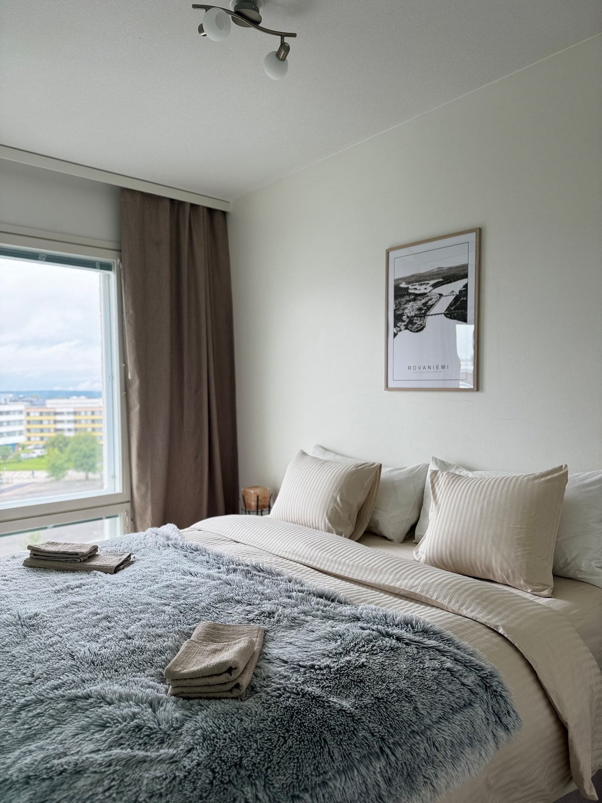 Welcome to our cozy and fully equipped one-bedroom apartment, perfect for 2-4 guests HOX! No parking slot •44 m2 Beautifully furnished apartment •Quiet location close to the city center •Grocery store right next door •Private balcony. •Free Wi-Fi >Just a 5-minute drive or 15-minute walk to the city center > 2-minute walk to the bus stop Distances by car: Santa Claus Village: 15 min Airport: 15 min Train station: 10 min Shopping centers: 3 min University: 10 min