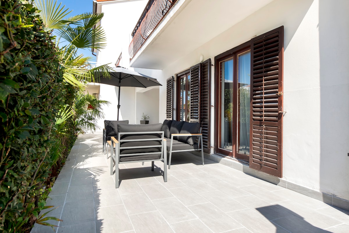 Íbúðin er staðsett nálægt miðbæ Opatija, í nokkurra mínútna fjarlægð á bíl eða í átta mínútna göngufjarlægð. Hún samanstendur af stofu, svefnherbergi, borðstofu, tveimur baðherbergjum, eldhúsi, gufubaði, setustofu í opnu rými, verönd, garði í kring og bílastæði. Þökk sé því að vera á jarðhæð með garði í kring hefur þú þá tilfinningu að leigja út hús en ekki íbúð.