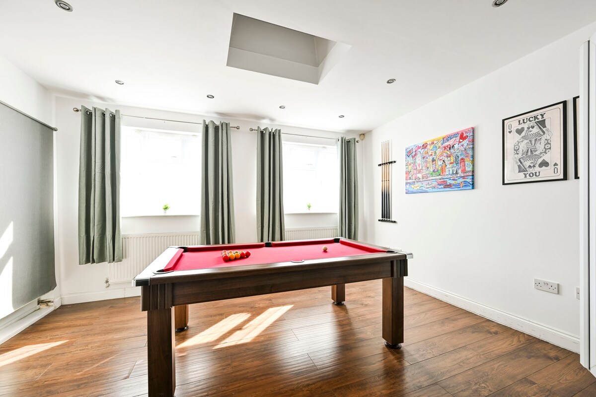 Kick back in your private cinema room (sofa bed included), take on friends at the pool table, or stay active in the home gym! This spacious 4/5 bedroom house has 2 sleek bathrooms (incl. ensuite) + a WC. Perfect for ExCeL, City Airport, contractors & those visiting London. With free parking, station nearby, and plenty of style & comfort, it’s the ideal base for a fun, hassle-free stay!