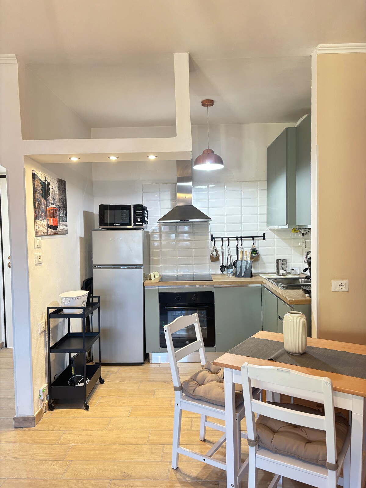 Falleg tveggja herbergja íbúð í glæsilegum umgjörðum, tilvalin fyrir gistingu í hæsta gæðaflokki. Fullkomin rými fyrir 4 manns: baðherbergi með sturtuklefa, stofa með sjónvarpi og svefnsófa, indukseldhús með öllum tækjum og falleg svíta með king-size rúmi. Fullkomið fyrir ferðamenn, vinnuferðir eða til að komast til Humanitas. Mjög nálægt sporvagni nr. 15 og ókeypis bílastæði undir húsinu. Afslöppun og frábær virkni. Íbúð án svalar og því er reykingar bannaðar. Við getum tekið á móti fjórum, þar á meðal ungbörnum