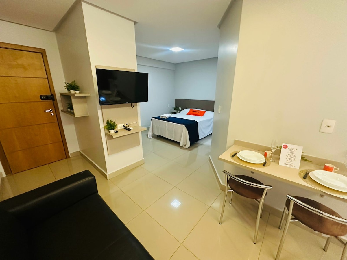 Nútímaleg 45 m² stúdíóíbúð efst í SETOR BUENO, á T-37 við T-63. Nærri Mater Dei HOSPITAL, Vaca Brava PARK, Goiânia SHOPPING og ORION læknamiðstöðinni, tilvalið fyrir afþreyingu, ráðgjöf, próf eða vinnu. Á svæðinu er Pão de Açúcar, Oba Hortifr, markaðir, apótek, kaffihús og fjölbreytt úrval af MAT. Í eigninni er rúm í QUEEN-stærð, aukarúm, loftkæling, hröð Wi-Fi-tenging, snjallsjónvarp og vel búið ELDHÚS sem tryggir þægilega, hagnýta og notalega dvöl sem hentar mismunandi þörfum.