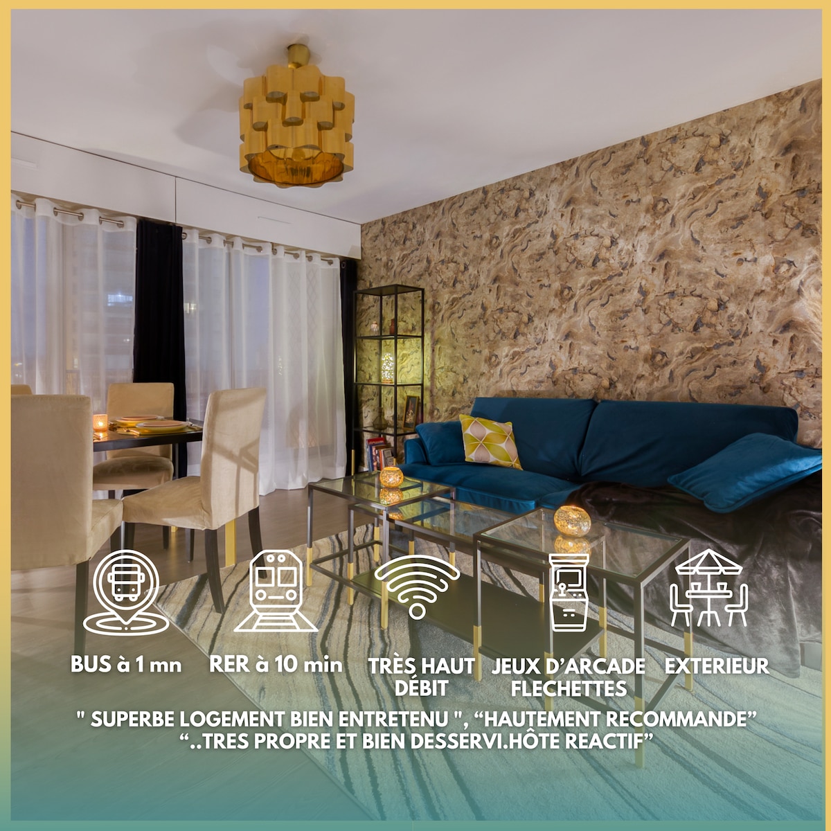 Það sem gerir íbúðina okkar einstaka er fyrst og fremst nálægð Stade de France, sem er aðeins í 50 metra fjarlægð. ⚐ Stíll íbúðarinnar hefur verið úthugsaður fyrir þig til að skemmta þér vel: setustofuborðið er hægt að breyta í pool-borð, íshokkí eða borðtennis. ❤þú getur skemmt þér með vinum þínum eða fjölskyldu á meðan þú nýtur óhindraðs útsýnis frá svölunum á Basilíku Saint-Denis og Canal Saint-Denis, án þess að hafa útsýni yfir. ☼