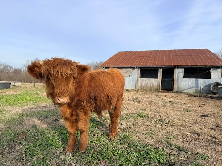 Burstaðu og gefðu hálandskúm á sólsetri