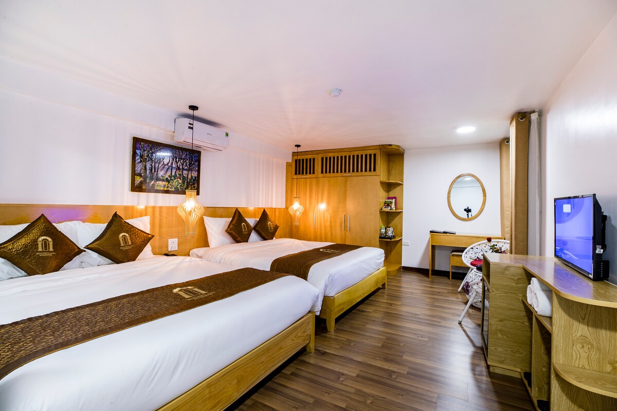 This is deluxe family room inside a 3 star hotel located right in Sapa town. It’s ideally situated in the peaceful centre area of Sapa, just a few minutes to Sapa Church and local market by walking. All rooms have large window and balcony. It offers fabulous views of the lake, Ham Rong and Fanxipan mountain. Spacious Family room with 2 queen beds can host maximum 5 guests (extra bed on request), suitable for Family or group. Breakfast buffet is served at restaurant, included room price