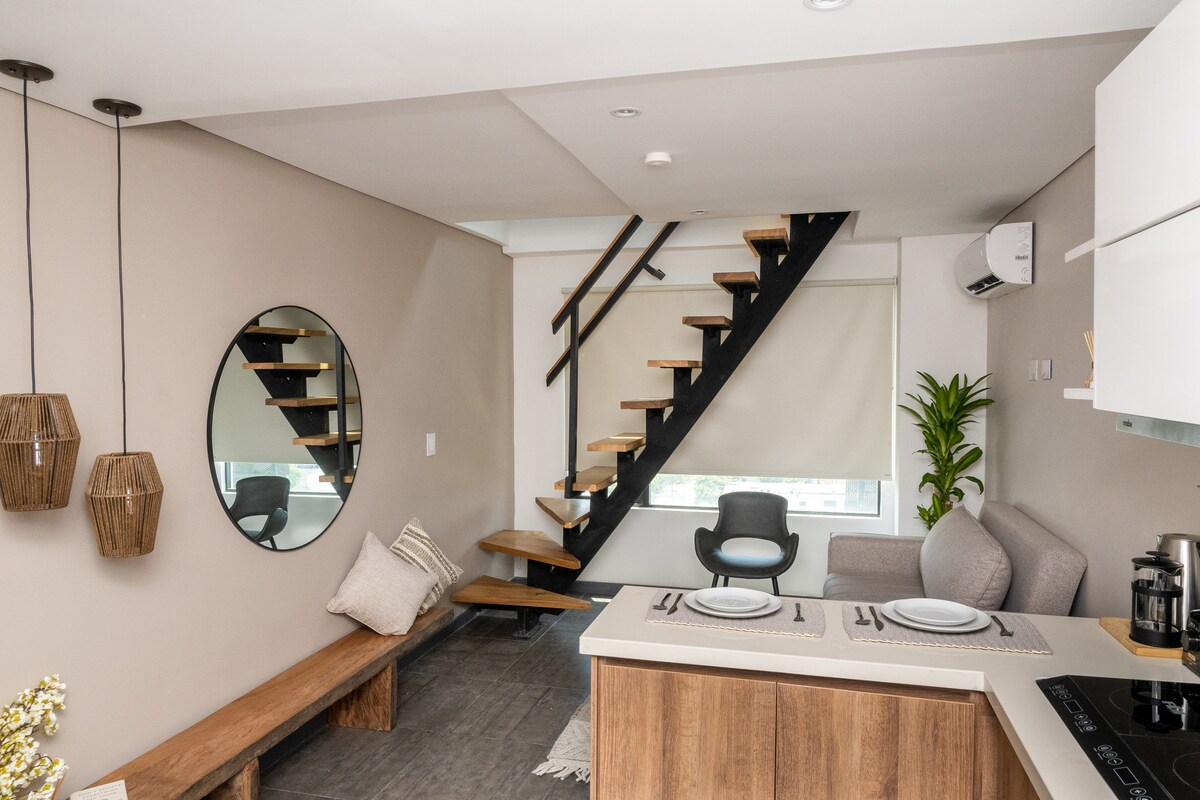 Sökktu þér í nútímalega og notalega tveggja hæða loftíbúð þar sem hvert smáatriði hefur verið vandlega hannað til að tryggja þægindi þín. Hér er góð staðsetning, í nokkurra mínútna fjarlægð frá heilsugæslustöðvum, Viva-verslunarmiðstöðinni og góðum veitingastöðum. Fullkomið fyrir ferðamenn, fjölskyldur eða læknismeðferð. Í byggingunni er sundlaug, tyrkneskt bað, gufubað, kaffihús og aðgangur að Smart Fit ræktarstöð (aukagreiðsla) þar sem hvíld, vinna og vellíðan koma saman.