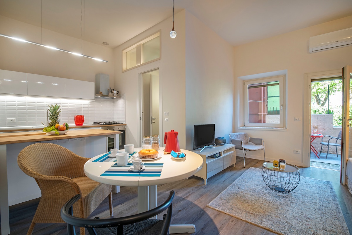 Íbúðin okkar er stór (80 fermetrar) og björt, með útsýni yfir innri garða og Molino Stucky. Yndislegur sameiginlegur garður tekur á móti þér þegar þú kemur. Íbúðin er á fyrstu hæð með lyftu. Það samanstendur af tveimur björtum og rúmgóðum svefnherbergjum (eitt með tvíbreiðu rúmi og eitt með einbreiðum rúmum), stóru baðherbergi með baði / sturtu og þvottavél, nútímalegu og virku eldhúsi, borðstofu / stofu með svefnsófa, sjónvarpi og ÞRÁÐLAUSU NETI.