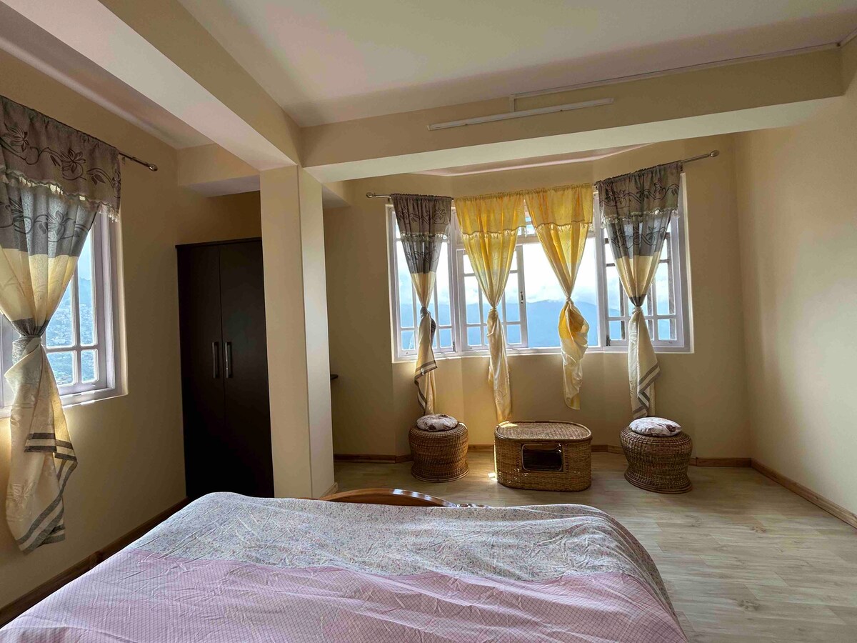 Nýuppgerða þakíbúðin okkar býður gestum okkar upp á notalegan sal með tveimur svefnherbergjum og rafmagnseldhúsi. Íbúðin býður upp á 180 gráðu útsýni yfir Kanchenjunga svæðið og gróskumiklar grænar hæðir frá eldhúsinu/salnum og einu svefnherbergjanna. Þetta er önnur skráningin okkar í sömu byggingu/eign, miðsvæðis, sem er steinsnar frá MG Marg. Með þeim fyrstu umsögnum og einkunnum sem tala sínu máli. Við viljum bjóða gestum okkar eina af bestu upplifunum þeirra á Airbnb.