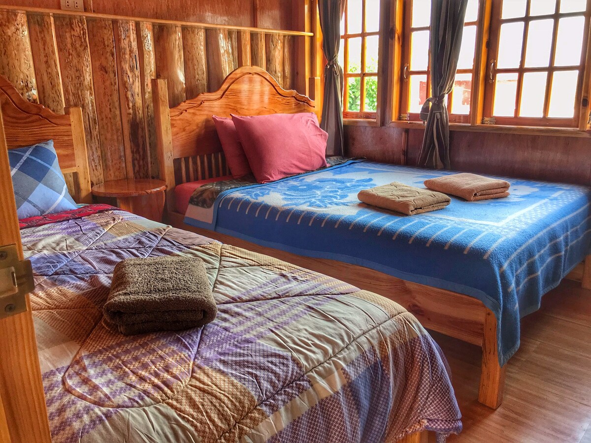 This is the Armiro Room, a cozy cabin style room. It has a double sized bed and a single sized bed. It has its own private bathroom with hot and cold shower.