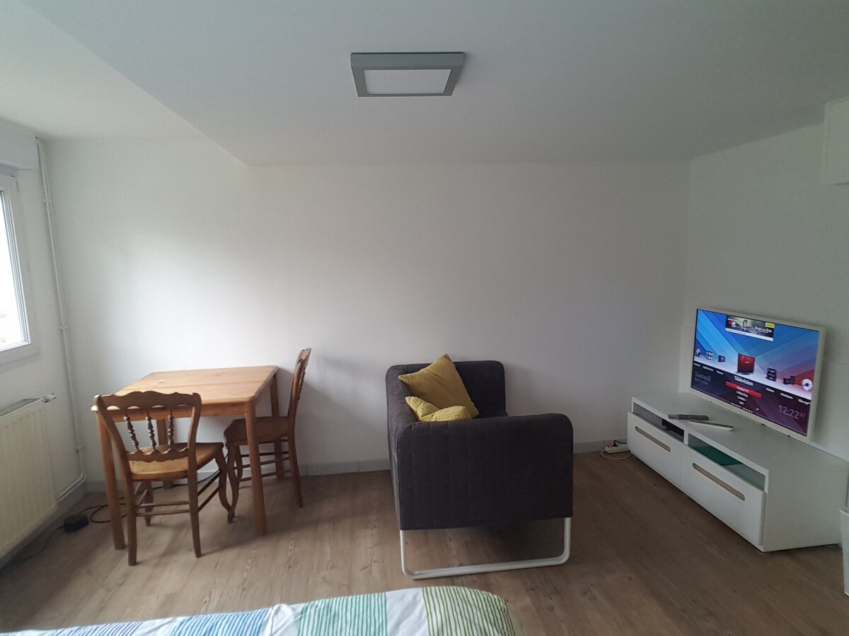 Róleg og rúmgóð íbúð á jarðhæð hússins, með útsýni yfir garðinn, með rúmi, sjónvarpi, eldhúsi, baðherbergi, aðskildu salerni, geymslu. -Decathlon Arena leikvangurinn í 30 mínútna göngufjarlægð. -metro 4 Cantons 5 mínútur með bíl (ókeypis vörður bílastæði), 25 mínútna göngufjarlægð. -vísindaleg borg og Haute Borne í 15 mínútna göngufjarlægð. Verslanir, veitingastaðir, barir, apótek, bensínstöð, almenningssamgöngur innan 500m. ATHUGIÐ! Lofthæð 2m á stöðum.