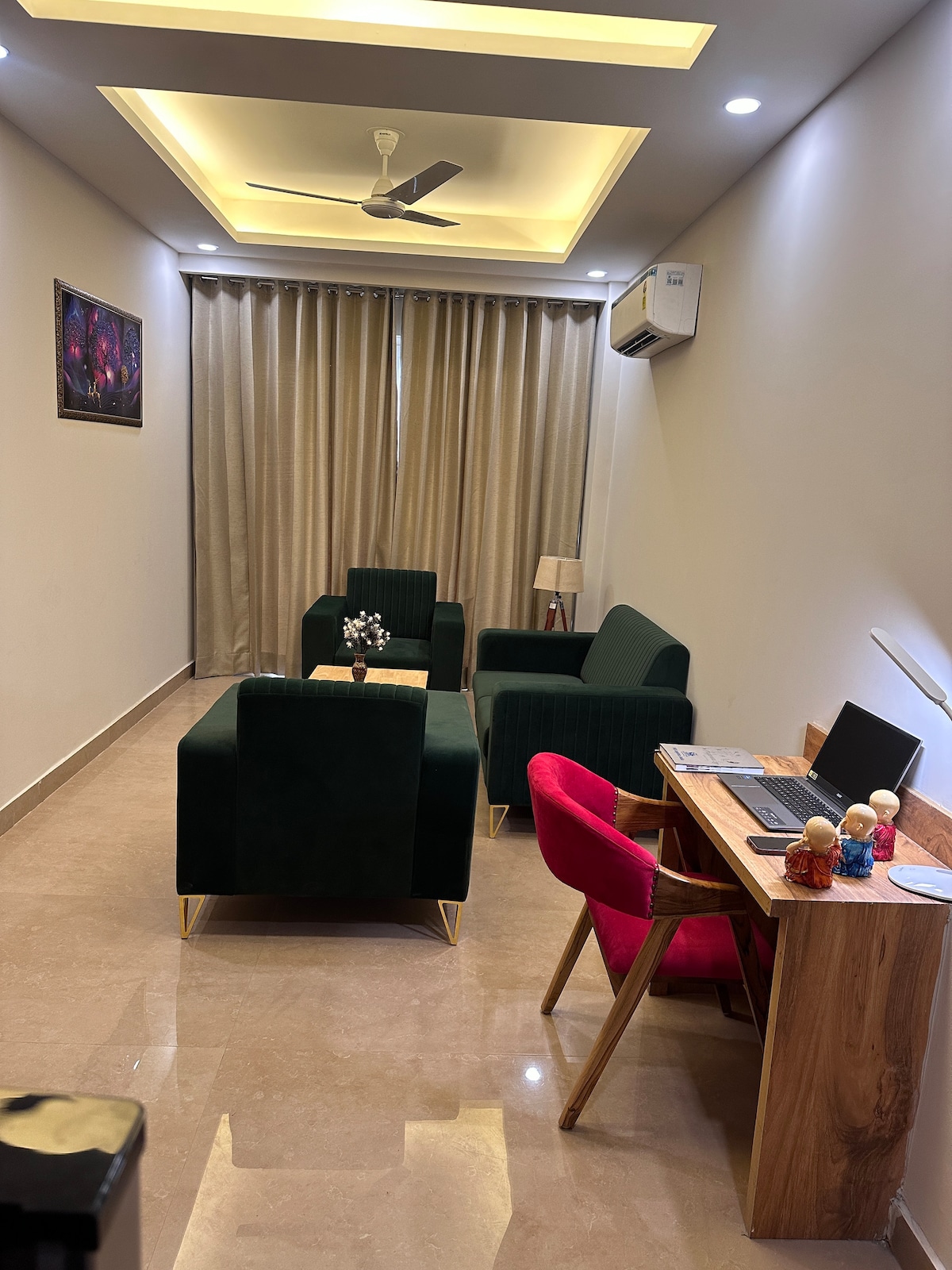 Velkomin/nn í Green View: bjarta og rúmgóða 3 herbergja gistingu á jarðhæð í F-Block Saket, aðeins 500 metrum frá Malviya Nagar Metro, PVR Anupam og Select CityWalk / DLF Avenue. Njóttu king-size rúma, baða, loftræstingar/hita, loftræstara, snjallsjónvarpa, vinnustöðva og úrvals rúmfata. Slakaðu á í sólríkri stofu, eldaðu í fullbúnu eldhúsi eða slakaðu á í grænu almenningsgörðunum hinum megin við götuna. Rólegur og þægilegur áfangastaður í Suður-Delí.