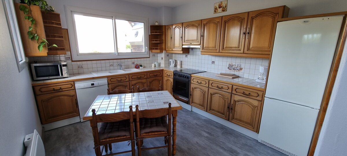 * Eldhúsið er fullbúið * Stofan er búin 2 sófum og 2 "slaka á" hægindastólum, 1 stóru sófaborði, háskerpusjónvarpi. * 4 svefnherbergin eru með „queen“ rúm með mjög þægilegum rúmfötum. 2 barnarúm eru til ráðstöfunar. * 1 sturta og 1 salerni uppi. 1 baðherbergi með sturtu og 1 aðskilið salerni á jarðhæð. * Verönd með gasgrilli og garðhúsgögnum. * 250 m2 blómstraður og skógivaxinn garður. * Einka lokað bílastæði fyrir 2 ökutæki. * HD þráðlaust net innifalið