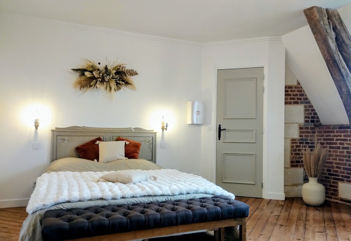 L'ancien atelier de notre bâtisse rénové en appartement cathédrale offre une vue incroyable sur la campagne normande. En famille ou entre amis, vous pourrez admirer le coucher de soleil sur les champs de blé ou de lin selon les saisons. Vous pourrez vous ressourcer ou tout simplement profiter d'un moment de détente. Il est temps de se créer des souvenirs! Bonheur et épicurisme sont de rigueur au gîte « L'Atelier de Louis" meublé de tourisme classé****