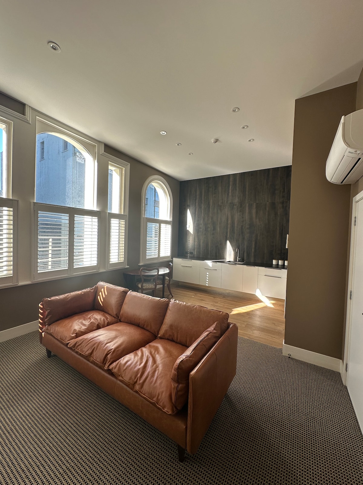 Modern, compact apartment nestled within a historic building, industrial chic meets city-center convenience. Close to Princes Street and two blocks away from the Octagon, town hall, and casino, in the heart of Dunedin city. Plus, Dunedin Hospital and the University are within easy reach. Great places to eat nearby like Speights Ale House and Etrusco at the Savoy. Short taxi to Forsythe Barr stadium or around 30 minutes walking. Unlimited great quality broadband. Cycle storage available.