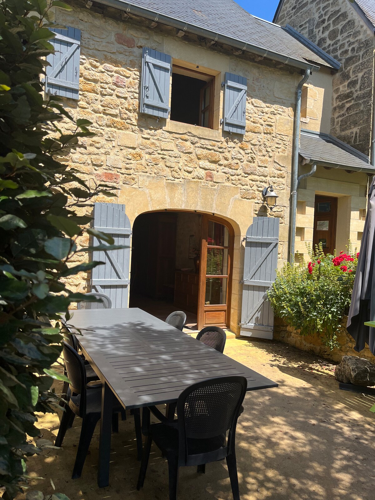 Beautiful cottage with beams and exposed stone just renovated November 2019 Parking and entrance into private courtyard garden with covered eating terrace and your very own jacuzzi. French doors into house The kitchen is fully equipped, the lounge has very comfortable furniture and pretty French antiques, The river vezere is only 50 metres on our own land, excellent for canoeing, wild swimming and picnicking 2 minutes by car to a stunning medieval village 25 minutes from center of Sarlat