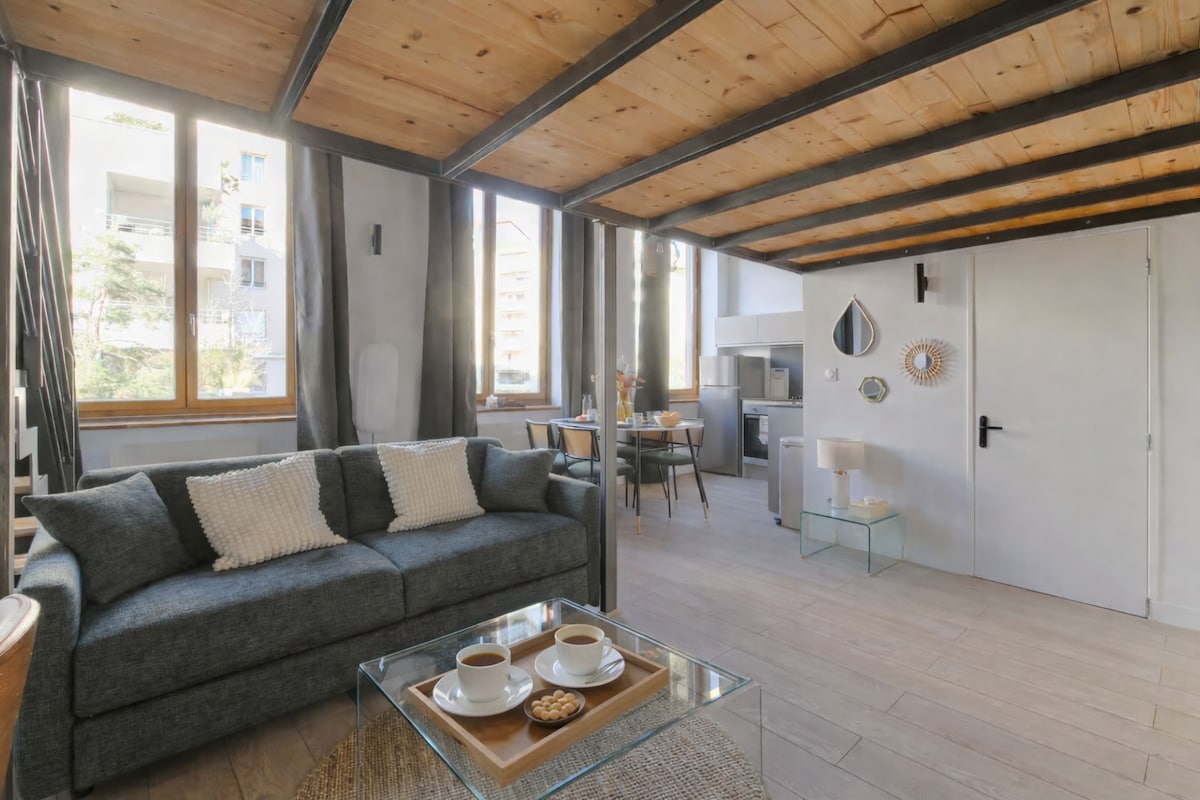 Notalega og hagnýta íbúðin okkar býður upp á allt sem þú þarft fyrir þægilega dvöl. Það er staðsett í Champagne au Mont d 'Or við hlið Lyon og býður upp á greiðan aðgang að miðborginni með hraðbrautum eða almenningssamgöngum sem eru í 5 mínútna göngufjarlægð. Njóttu einkabílastæði, sjálfsinnritunar, þráðlauss nets með trefjum, aðgangs að Netflix og útbúins eldhúss. Aðskilið svefnherbergi,svefnsófi, nútímalegt baðherbergi. Fullkomið fyrir afslappaða gistingu eða faglega gistingu.