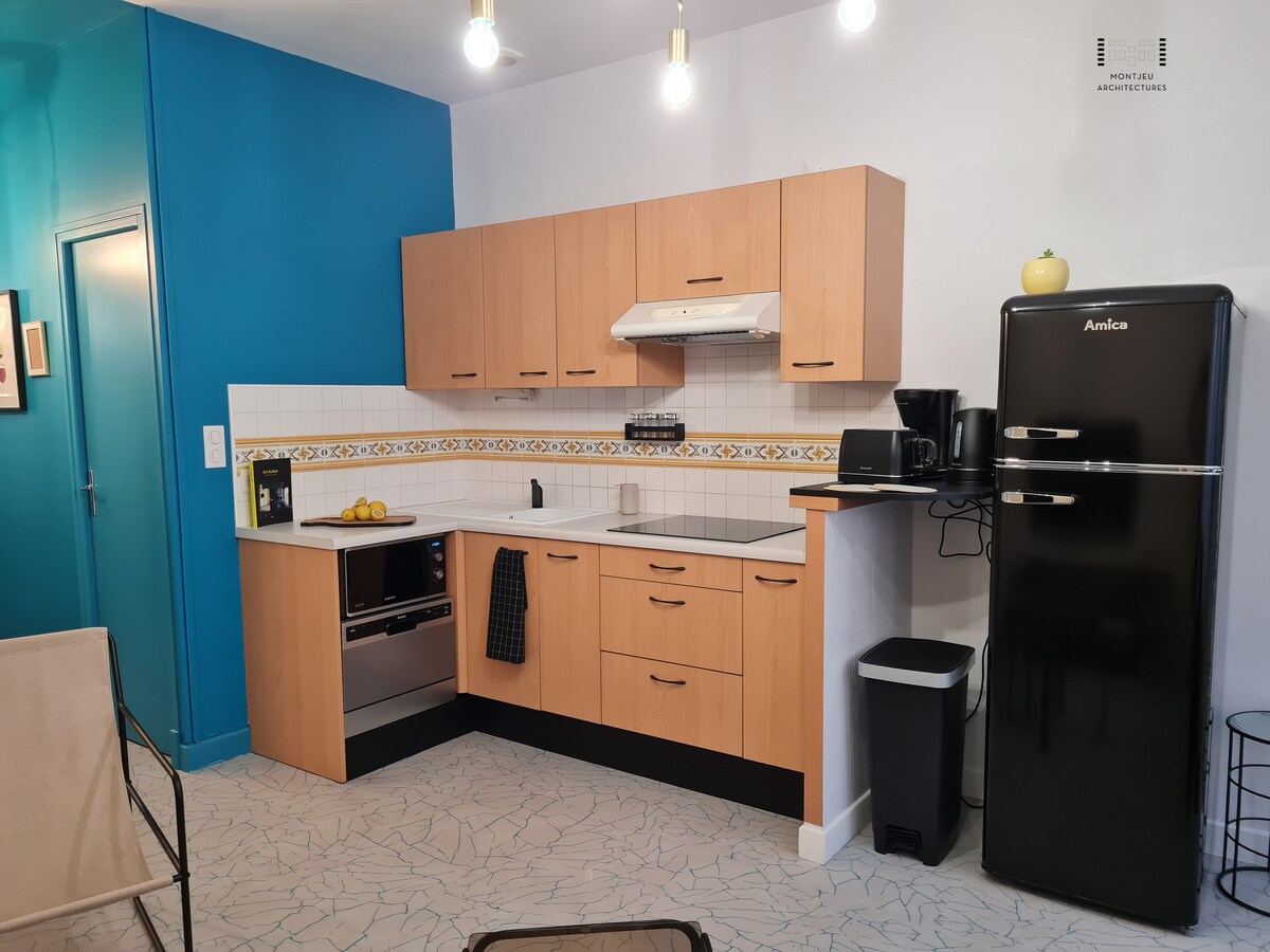 Þetta er heillandi íbúð endurnýjuð og algjörlega innréttuð af okkur. Það samanstendur af tveimur hlutum. Það er á fyrstu hæð í byggingu. Allur sameiginlegur búnaður, þ.e.: T.V, ísskápur, rafmagnshellur, örbylgjuofn, kaffivél, ketill... eru í boði fyrir gesti. Rúmföt eru til staðar ásamt baðhandklæðum og tehandklæðum fyrir eldhúsið.
