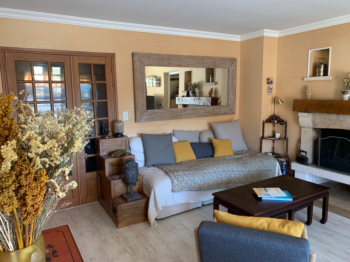 Komdu og slappaðu af í þessu húsi sem er staðsett í mjög notalegu umhverfi. Stór sundlaug sem er hituð upp í 35/37 gráður gerir það að verkum að þú gleymir daglegu lífi þínu. Þægindin draga þig á tálar: - Svefnherbergi: 2 metra rúm með lögun minni og gorm, notaleg lýsing. - Baðherbergi: Sturta, tvöfaldur vaskur, snyrtiborð, salerni ( annað sjálfstætt salerni í húsinu). - Uppbúið eldhús - Stofa: píanó, fótbolti, borðspil, sjónvarp. Alexa tengdur hátalari.