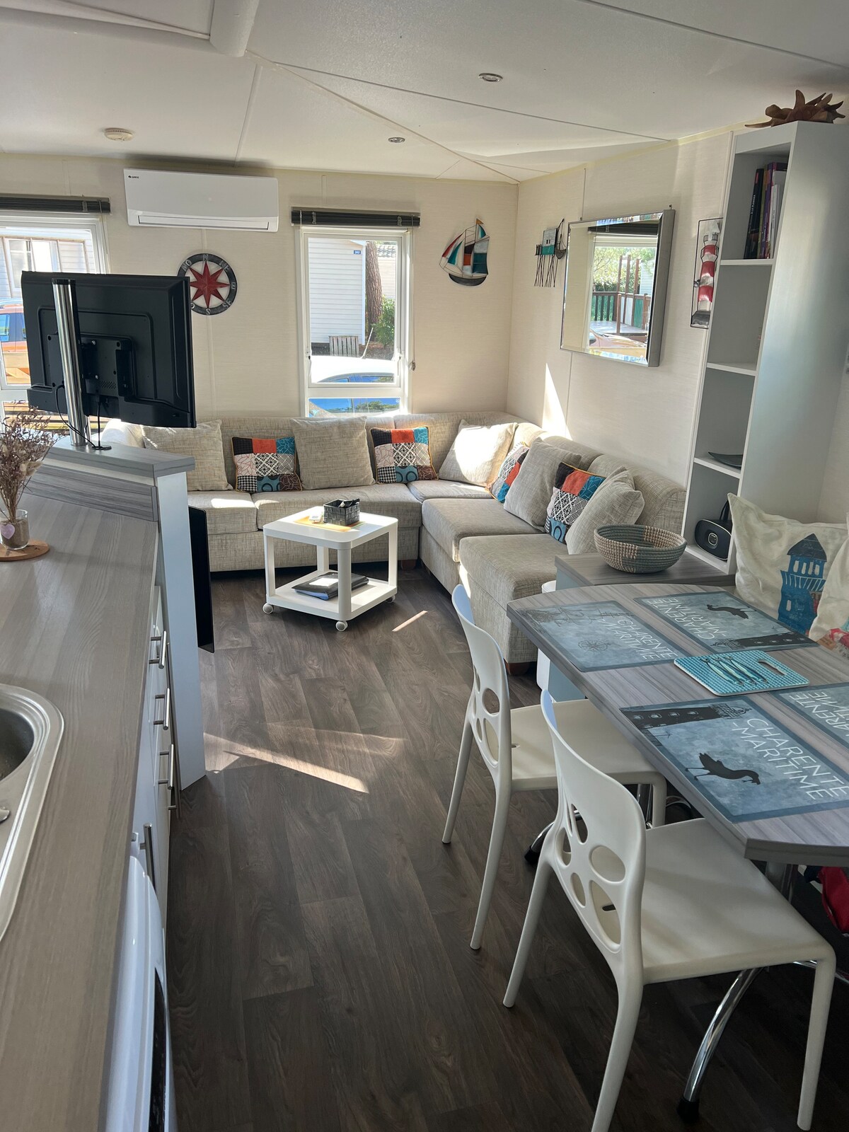 Beau mobil home confortable et spacieux 40m² (achat 2022) pouvant accueillir 6 personnes, situé dans le village vacances 4*"les Charmettes" à la Palmyre. La pièce à vivre se compose d'un grand salon avec canapé d'angle convertible, table de salon et d'une cuisine toute équipée avec nombreux rangements. Il dispose de 3 chambres (1 chambre avec lit double et dressing et 2 chambres avec 2 lits simples), d'un WC séparé et d'une salle de bains. A l'extérieur se trouve une terrasse couverte de 16m²