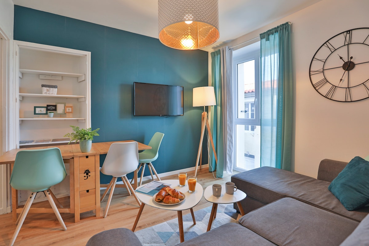 Kostir þessarar mjög björtu 3* ** íbúðar sem er 35 m²: - fullkomlega staðsett í hjarta hins dæmigerða Quartier du Passage, 1 mínútu frá ströndinni! - ný rúmföt árið 2024 Queen Size 160x200! - 1 aðskilið svefnherbergi - rúmföt og handklæði fylgja - enginn viðbótarkostnaður eða falinn kostnaður til að bæta við: mörg aðstaða okkar stendur þér til boða án endurgjalds (ferðarúm, barnastólar, strandleikföng, markaðsvagnar o.s.frv.) - mögulegt er að skilja eftir farangur frá kl. 14:00 (sjá nánari upplýsingar í tilkynningunni)